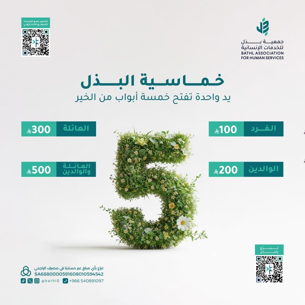 خماسية البذل، يد واحدة تفتح خمسة أبواب من الخير بـ100 ريال فقط!ساهموا بـ20 ريال لكل مشروع:• افطار صائم من خلال مشروع إفطار صائم.• ساعدوا بتوفير مياه ا...